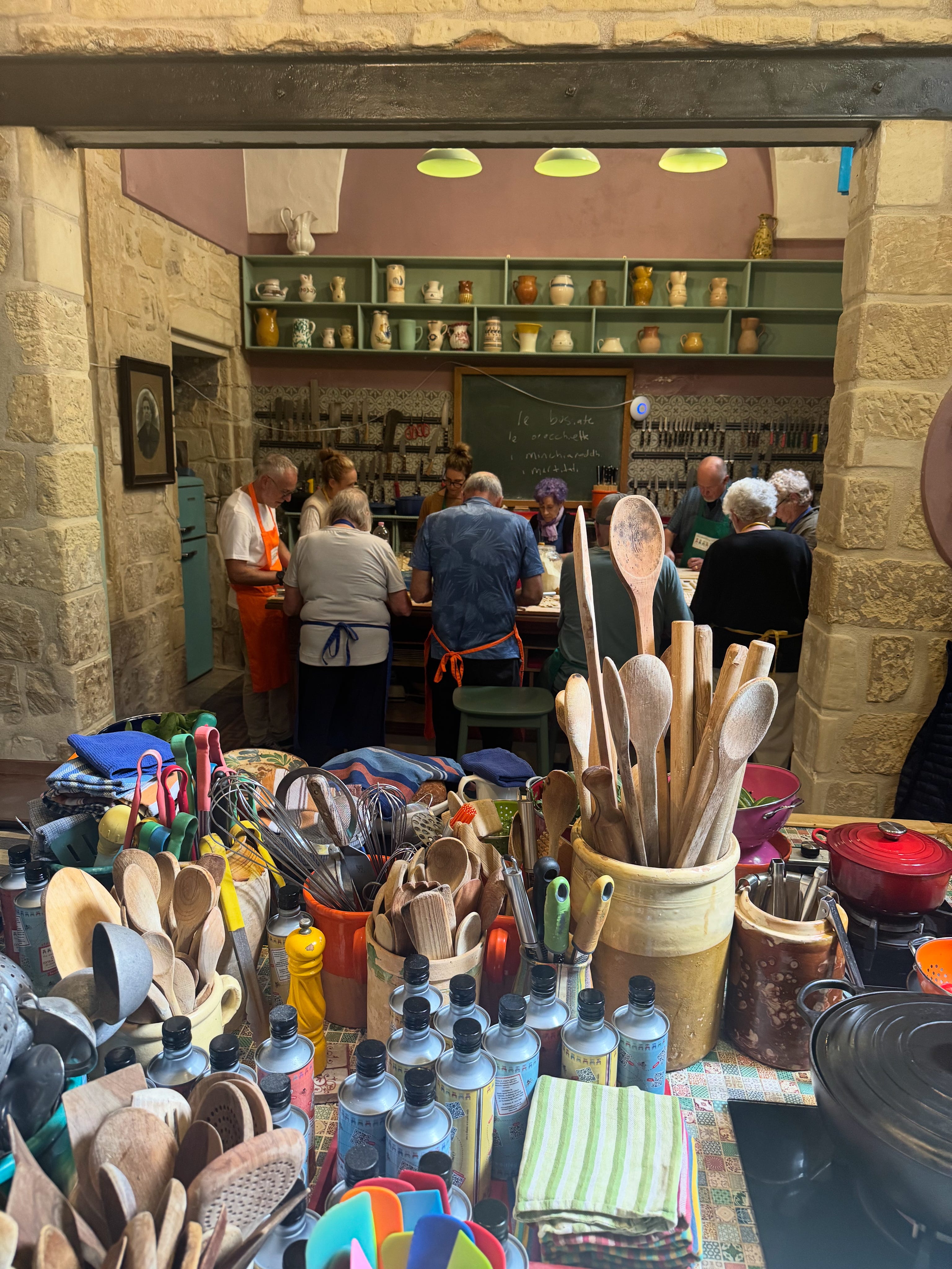 Above a group of French, South Africans, Americans and English prepare pasta before lunch in the new Lecce school. We reopened just up the street in late spring.