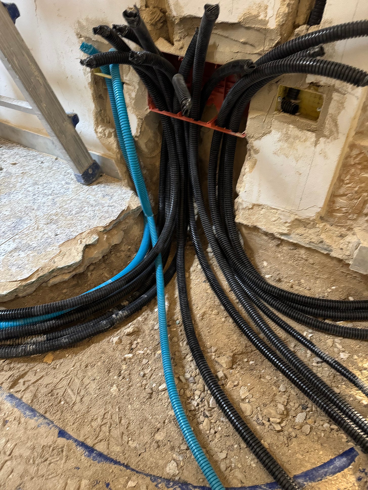One month in and we’re still in the intestinal phase, where naked twisty tubes breach the walls and floors, leaving a series of channels and crevasses that cause the boys to constantly prolong their gate to step over them. And Ciccia to ‘help’, gleefully digging into all the gravel and dirt they are using to cover the new plumbing and electrical.